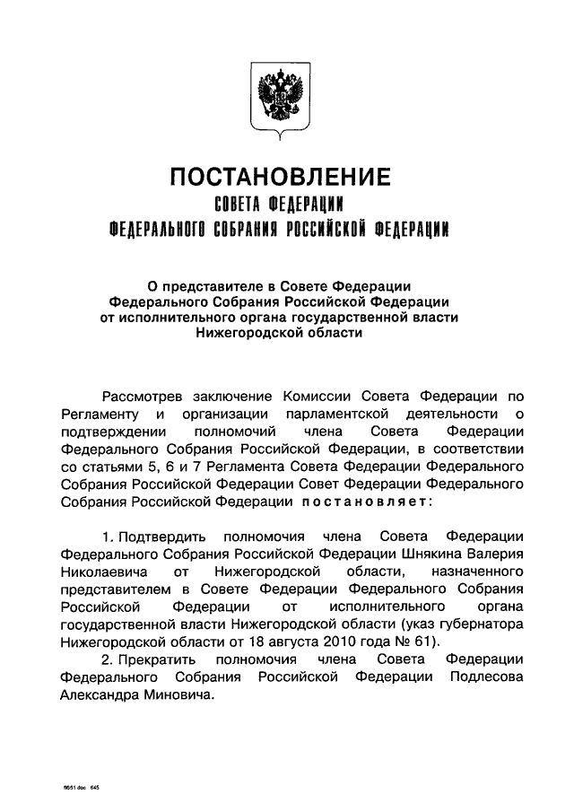 "О ПРЕДСТАВИТЕЛЕ В СОВЕТЕ ФЕДЕРАЦИИ ФЕДЕРАЛЬНОГО СОБРАНИЯ РОССИЙСКОЙ ФЕДЕРАЦИИ ОТ ИСПОЛНИТЕЛЬНОГО ОРГАНА ГОСУДАРСТВЕННОЙ ВЛАСТИ НИЖЕГОРОДСКОЙ ОБЛАСТИ"