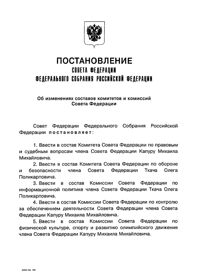 "ОБ ИЗМЕНЕНИЯХ СОСТАВОВ КОМИТЕТОВ И КОМИССИЙ СОВЕТА ФЕДЕРАЦИИ"