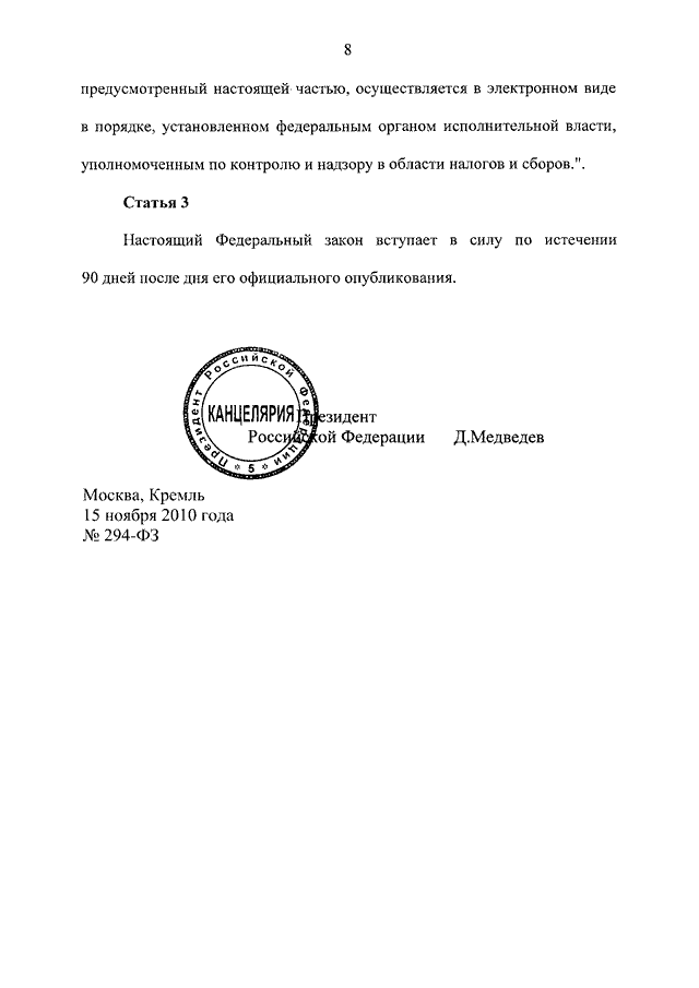 ФЕДЕРАЛЬНЫЙ ЗАКОН от 15.11.2010 N 294-ФЗ
