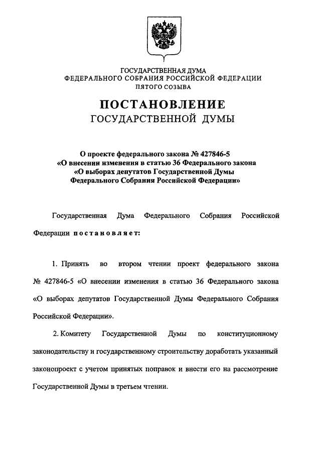 "О ПРОЕКТЕ ФЕДЕРАЛЬНОГО ЗАКОНА N 427846-5 "О ВНЕСЕНИИ ИЗМЕНЕНИЯ В СТАТЬЮ 36 ФЕДЕРАЛЬНОГО ЗАКОНА "О ВЫБОРАХ ДЕПУТАТОВ ГОСУДАРСТВЕННОЙ ДУМЫ ФЕДЕРАЛЬНОГО СОБРАНИЯ РОССИЙСКОЙ ФЕДЕРАЦИИ"