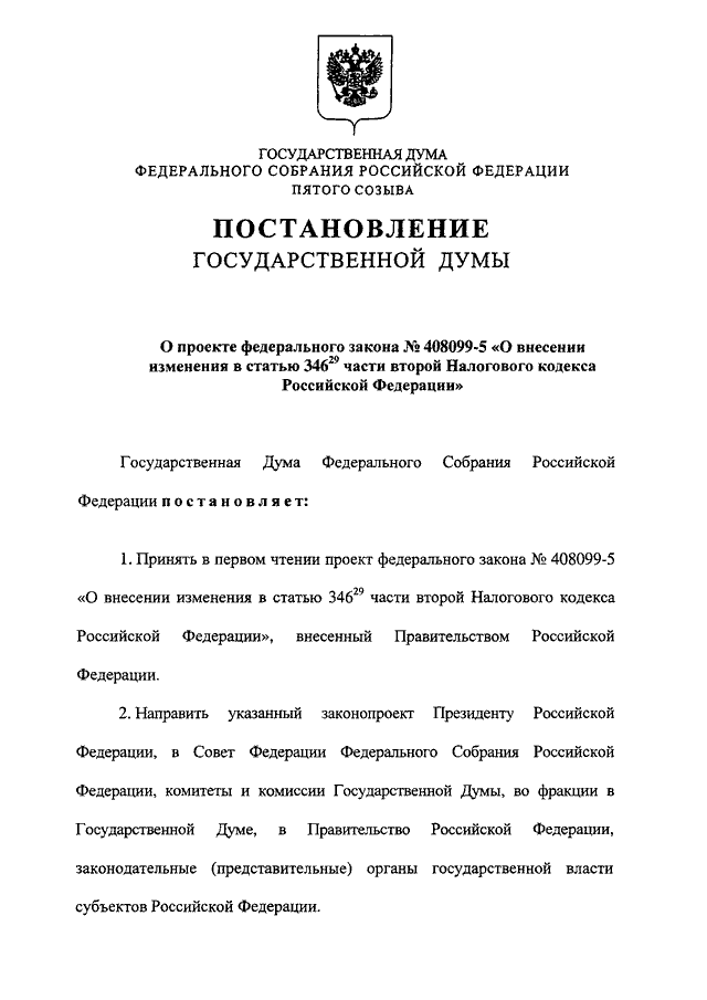 "О ПРОЕКТЕ ФЕДЕРАЛЬНОГО ЗАКОНА N 408099-5 "О ВНЕСЕНИИ ИЗМЕНЕНИЯ В СТАТЬЮ 346.29 ЧАСТИ ВТОРОЙ НАЛОГОВОГО КОДЕКСА РОССИЙСКОЙ ФЕДЕРАЦИИ"