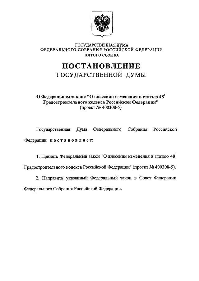 "О ФЕДЕРАЛЬНОМ ЗАКОНЕ "О ВНЕСЕНИИ ИЗМЕНЕНИЯ В СТАТЬЮ 48.1 ГРАДОСТРОИТЕЛЬНОГО КОДЕКСА РОССИЙСКОЙ ФЕДЕРАЦИИ" (ПРОЕКТ N 400308-5)"