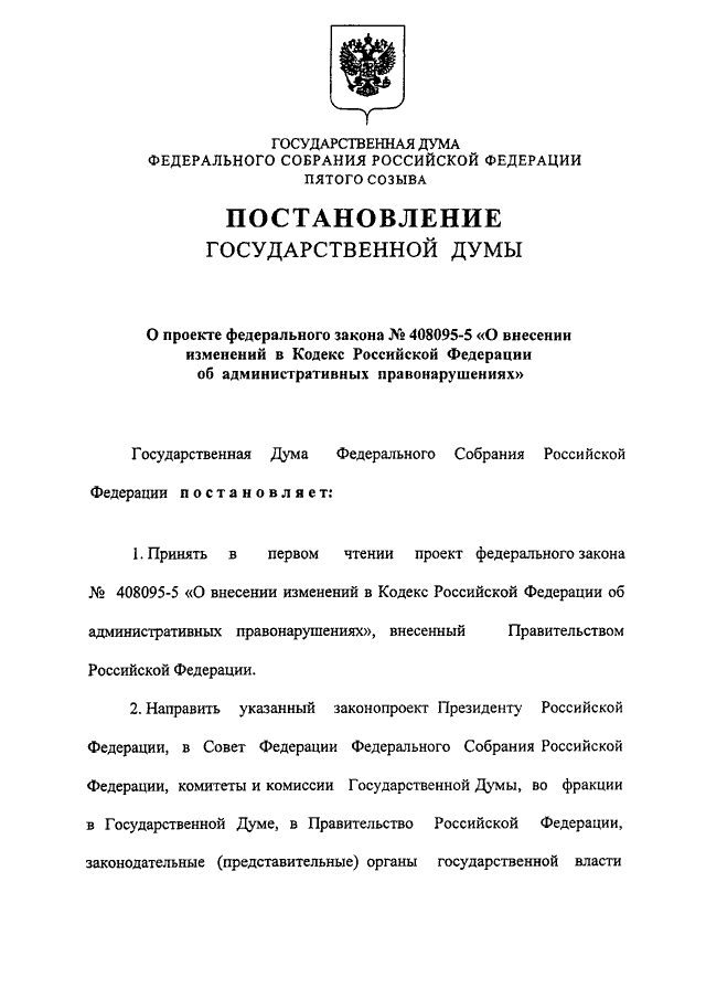 "О ПРОЕКТЕ ФЕДЕРАЛЬНОГО ЗАКОНА N 408095-5 "О ВНЕСЕНИИ ИЗМЕНЕНИЙ В КОДЕКС РОССИЙСКОЙ ФЕДЕРАЦИИ ОБ АДМИНИСТРАТИВНЫХ ПРАВОНАРУШЕНИЯХ"