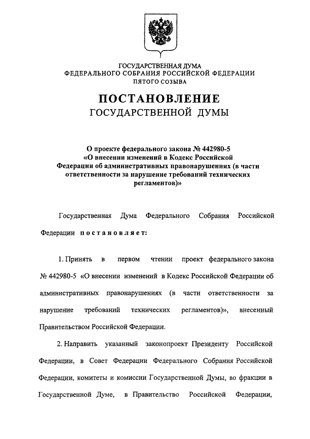 "О ПРОЕКТЕ ФЕДЕРАЛЬНОГО ЗАКОНА N 442980-5 "О ВНЕСЕНИИ ИЗМЕНЕНИЙ В