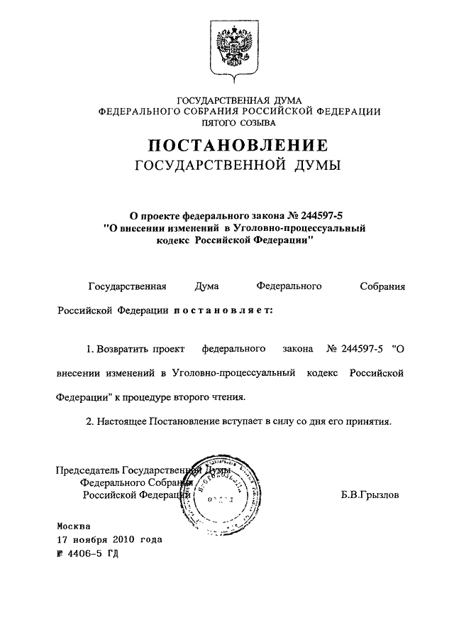 ПОСТАНОВЛЕНИЕ ГД ФС РФ от 17.11.2010 N 4406-5 ГД