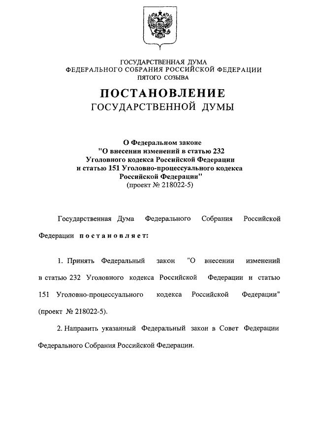 "О ФЕДЕРАЛЬНОМ ЗАКОНЕ "О ВНЕСЕНИИ ИЗМЕНЕНИЙ В СТАТЬЮ 232 УГОЛОВНОГО КОДЕКСА РОССИЙСКОЙ ФЕДЕРАЦИИ И СТАТЬЮ 151 УГОЛОВНО - ПРОЦЕССУАЛЬНОГО КОДЕКСА РОССИЙСКОЙ ФЕДЕРАЦИИ" (ПРОЕКТ N 218022-5)"