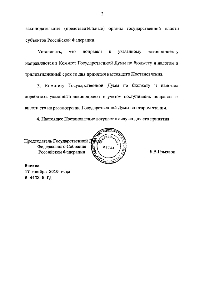 ПОСТАНОВЛЕНИЕ ГД ФС РФ от 17.11.2010 N 4422-5 ГД
