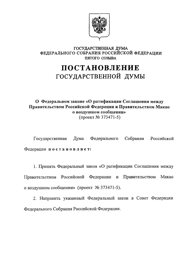"О ФЕДЕРАЛЬНОМ ЗАКОНЕ "О РАТИФИКАЦИИ СОГЛАШЕНИЯ МЕЖДУ ПРАВИТЕЛЬСТВОМ РОССИЙСКОЙ ФЕДЕРАЦИИ И ПРАВИТЕЛЬСТВОМ МАКАО О ВОЗДУШНОМ СООБЩЕНИИ" (ПРОЕКТ N 373471-5)"