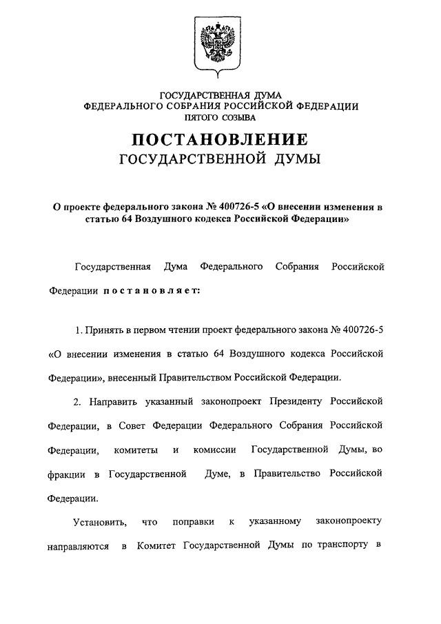 "О ПРОЕКТЕ ФЕДЕРАЛЬНОГО ЗАКОНА N 400726-5 "О ВНЕСЕНИИ ИЗМЕНЕНИЯ В СТАТЬЮ 64 ВОЗДУШНОГО КОДЕКСА РОССИЙСКОЙ ФЕДЕРАЦИИ"