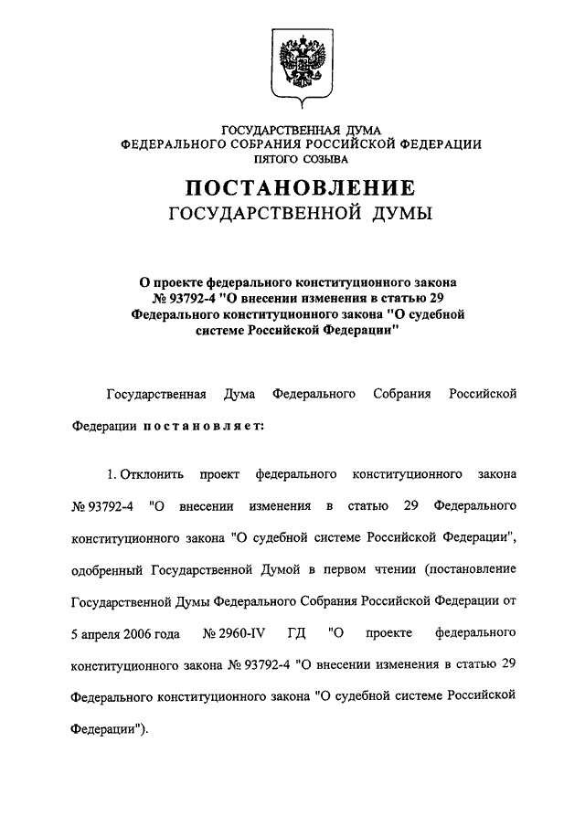 "О ПРОЕКТЕ ФЕДЕРАЛЬНОГО КОНСТИТУЦИОННОГО ЗАКОНА N 93792-4 "О ВНЕСЕНИИ ИЗМЕНЕНИЯ В СТАТЬЮ 29 ФЕДЕРАЛЬНОГО КОНСТИТУЦИОННОГО ЗАКОНА "О СУДЕБНОЙ СИСТЕМЕ РОССИЙСКОЙ ФЕДЕРАЦИИ"