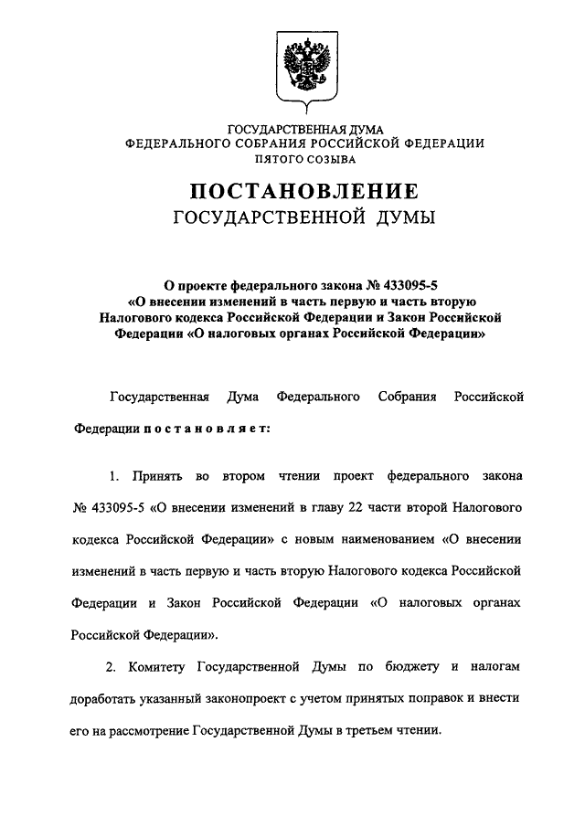 "О ПРОЕКТЕ ФЕДЕРАЛЬНОГО ЗАКОНА N 433095-5 "О ВНЕСЕНИИ ИЗМЕНЕНИЙ В ЧАСТЬ ПЕРВУЮ И ЧАСТЬ ВТОРУЮ НАЛОГОВОГО КОДЕКСА РОССИЙСКОЙ ФЕДЕРАЦИИ И ЗАКОН РОССИЙСКОЙ ФЕДЕРАЦИИ "О НАЛОГОВЫХ ОРГАНАХ РОССИЙСКОЙ ФЕДЕРАЦИИ"