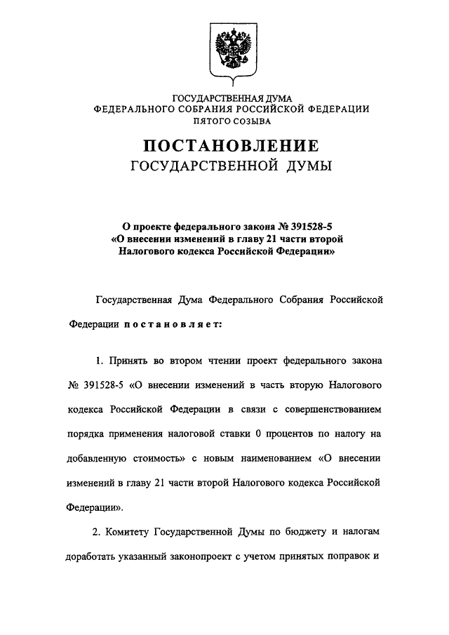 "О ПРОЕКТЕ ФЕДЕРАЛЬНОГО ЗАКОНА N 391528-5 "О ВНЕСЕНИИ ИЗМЕНЕНИЙ В ГЛАВУ 21 ЧАСТИ ВТОРОЙ НАЛОГОВОГО КОДЕКСА РОССИЙСКОЙ ФЕДЕРАЦИИ"
