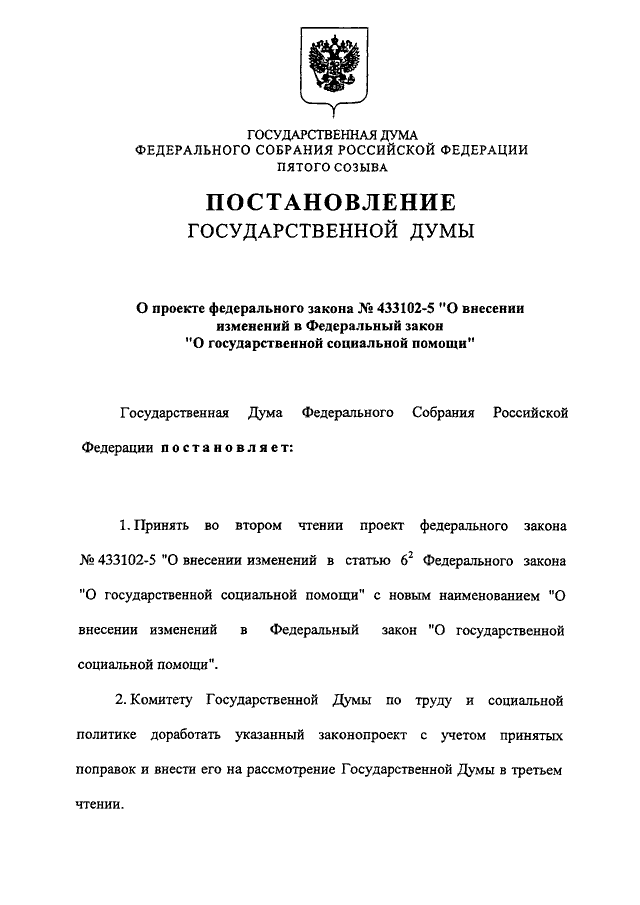 "О ПРОЕКТЕ ФЕДЕРАЛЬНОГО ЗАКОНА N 433102-5 "О ВНЕСЕНИИ ИЗМЕНЕНИЙ В ФЕДЕРАЛЬНЫЙ ЗАКОН "О ГОСУДАРСТВЕННОЙ СОЦИАЛЬНОЙ ПОМОЩИ"