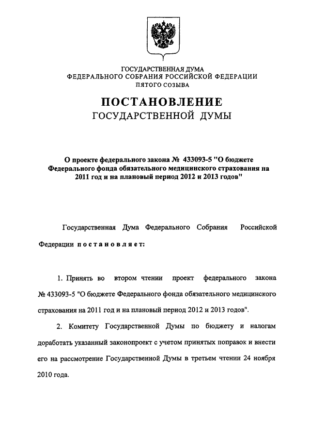 "О ПРОЕКТЕ ФЕДЕРАЛЬНОГО ЗАКОНА N 433093-5 "О БЮДЖЕТЕ ФЕДЕРАЛЬНОГО ФОНДА ОБЯЗАТЕЛЬНОГО МЕДИЦИНСКОГО СТРАХОВАНИЯ НА 2011 ГОД И НА ПЛАНОВЫЙ ПЕРИОД 2012 И 2013 ГОДОВ"