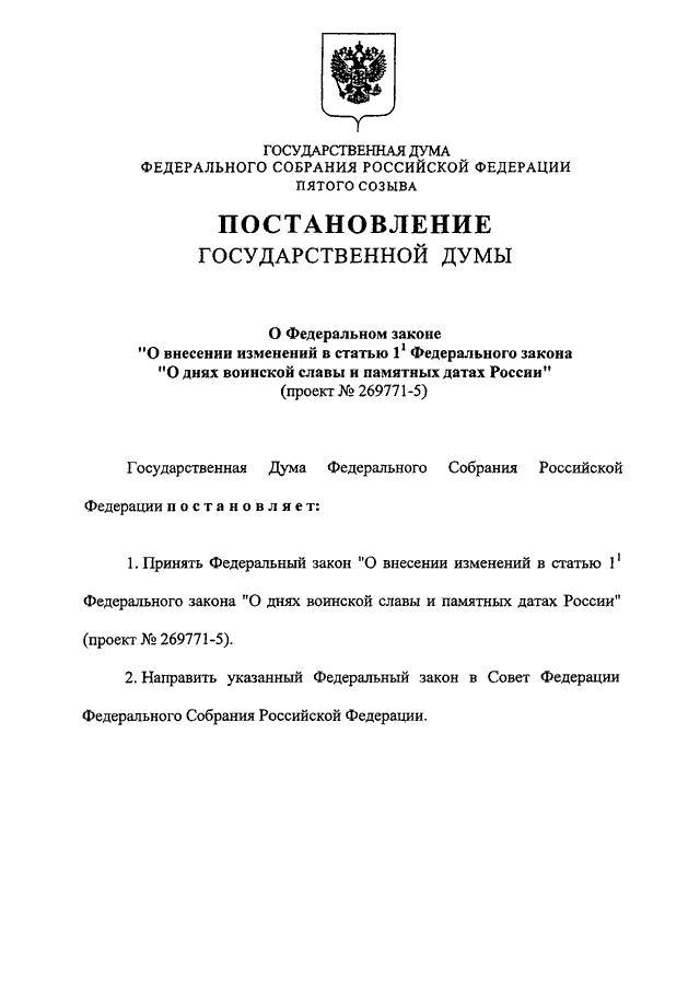 "О ФЕДЕРАЛЬНОМ ЗАКОНЕ "О ВНЕСЕНИИ ИЗМЕНЕНИЙ В СТАТЬЮ 1.1 ФЕДЕРАЛЬНОГО ЗАКОНА "О ДНЯХ ВОИНСКОЙ СЛАВЫ И ПАМЯТНЫХ ДАТАХ РОССИИ" (ПРОЕКТ N 269771-5)"