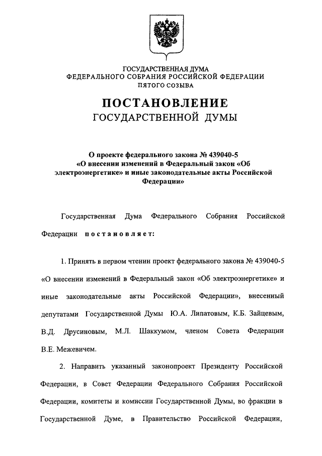 "О ПРОЕКТЕ ФЕДЕРАЛЬНОГО ЗАКОНА N 439040-5 "О ВНЕСЕНИИ ИЗМЕНЕНИЙ В ФЕДЕРАЛЬНЫЙ ЗАКОН "ОБ ЭЛЕКТРОЭНЕРГЕТИКЕ" И ИНЫЕ ЗАКОНОДАТЕЛЬНЫЕ АКТЫ РОССИЙСКОЙ ФЕДЕРАЦИИ"
