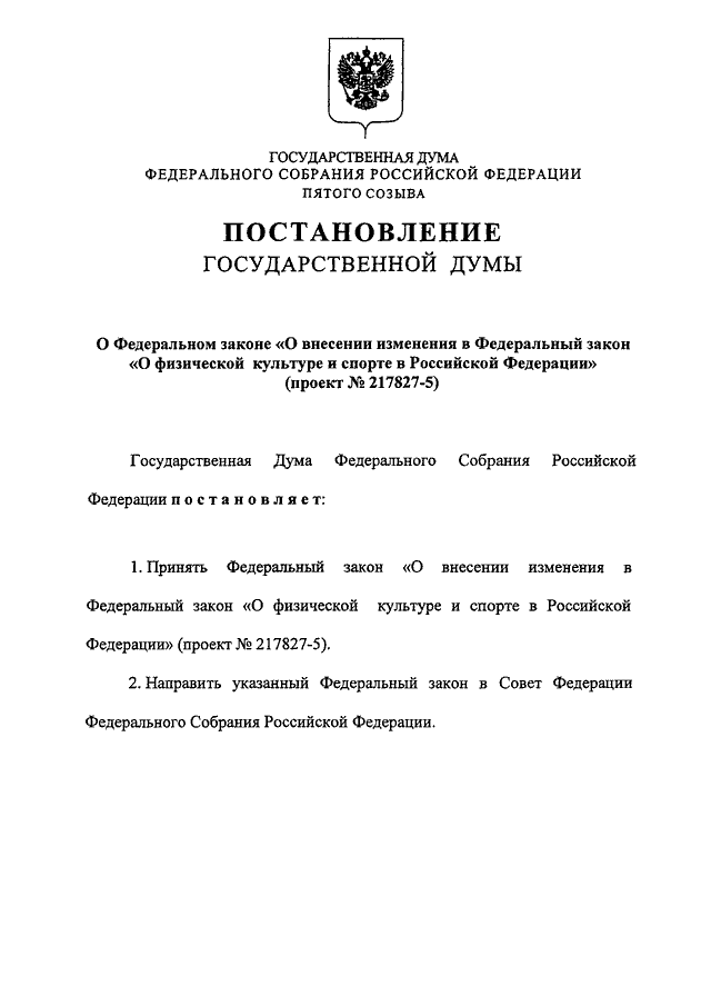 "О ФЕДЕРАЛЬНОМ ЗАКОНЕ "О ВНЕСЕНИИ ИЗМЕНЕНИЯ В ФЕДЕРАЛЬНЫЙ ЗАКОН "О ФИЗИЧЕСКОЙ КУЛЬТУРЕ И СПОРТЕ В РОССИЙСКОЙ ФЕДЕРАЦИИ" (ПРОЕКТ N 217827-5)"