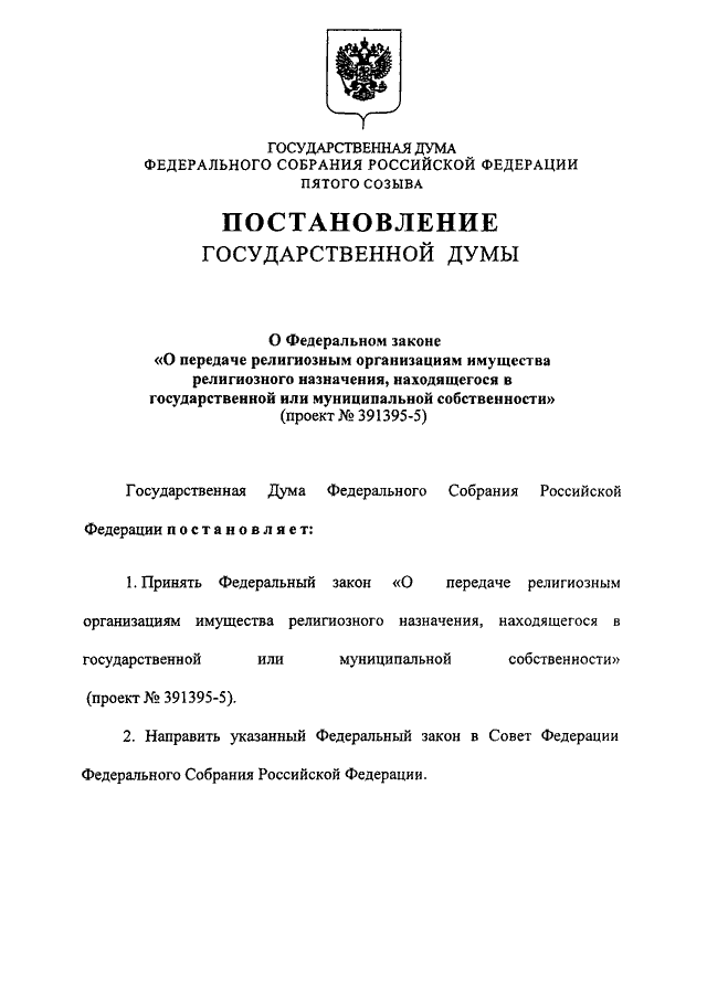 "О ФЕДЕРАЛЬНОМ ЗАКОНЕ "О ПЕРЕДАЧЕ РЕЛИГИОЗНЫМ ОРГАНИЗАЦИЯМ ИМУЩЕСТВА РЕЛИГИОЗНОГО НАЗНАЧЕНИЯ, НАХОДЯЩЕГОСЯ В ГОСУДАРСТВЕННОЙ ИЛИ МУНИЦИПАЛЬНОЙ СОБСТВЕННОСТИ" (ПРОЕКТ N 391395-5)"