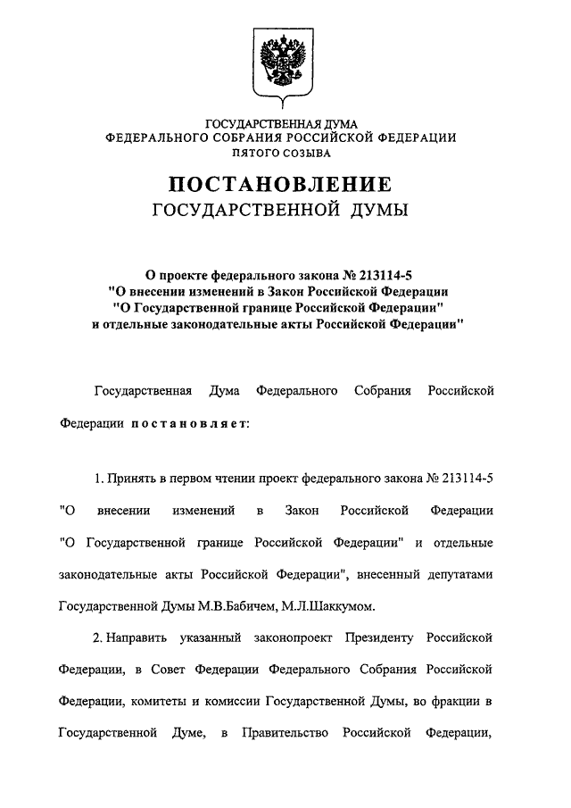 "О ПРОЕКТЕ ФЕДЕРАЛЬНОГО ЗАКОНА N 213114-5 "О ВНЕСЕНИИ ИЗМЕНЕНИЙ В ЗАКОН РОССИЙСКОЙ ФЕДЕРАЦИИ "О ГОСУДАРСТВЕННОЙ ГРАНИЦЕ РОССИЙСКОЙ ФЕДЕРАЦИИ" И ОТДЕЛЬНЫЕ ЗАКОНОДАТЕЛЬНЫЕ АКТЫ РОССИЙСКОЙ ФЕДЕРАЦИИ"
