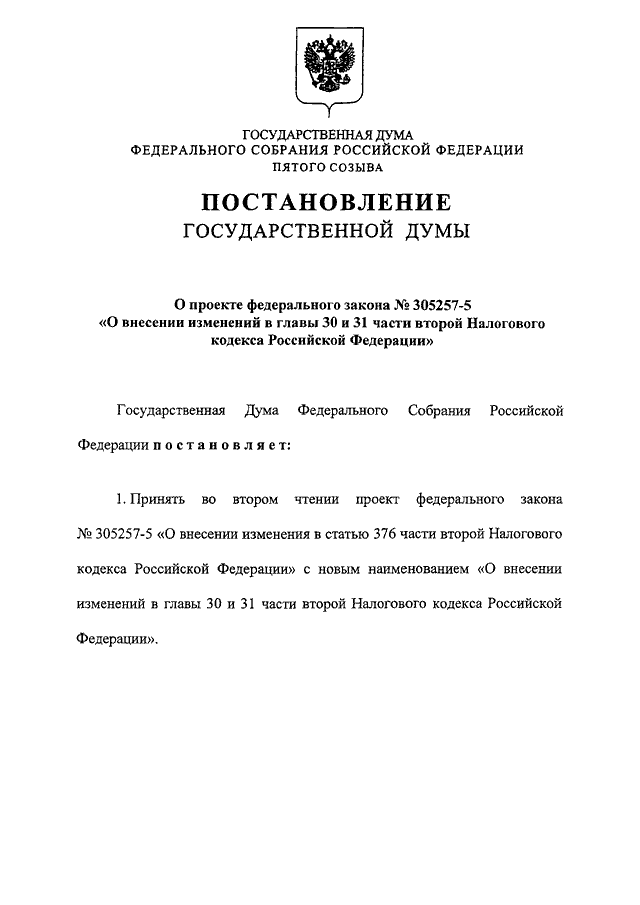 "О ПРОЕКТЕ ФЕДЕРАЛЬНОГО ЗАКОНА N 305257-5 "О ВНЕСЕНИИ ИЗМЕНЕНИЙ В ГЛАВЫ 30 И 31 ЧАСТИ ВТОРОЙ НАЛОГОВОГО КОДЕКСА РОССИЙСКОЙ ФЕДЕРАЦИИ"