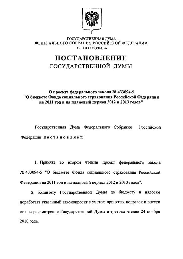 "О ПРОЕКТЕ ФЕДЕРАЛЬНОГО ЗАКОНА N 433094-5 "О БЮДЖЕТЕ ФОНДА СОЦИАЛЬНОГО СТРАХОВАНИЯ РОССИЙСКОЙ ФЕДЕРАЦИИ НА 2011 ГОД И НА ПЛАНОВЫЙ ПЕРИОД 2012 И 2013 ГОДОВ"