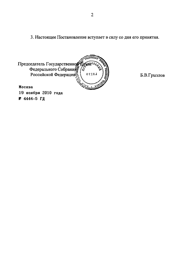 ПОСТАНОВЛЕНИЕ ГД ФС РФ от 19.11.2010 N 4444-5 ГД