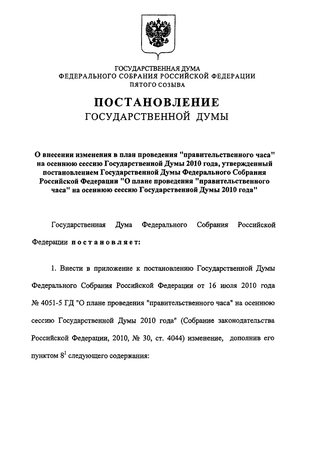 НА ОСЕННЮЮ СЕССИЮ ГОСУДАРСТВЕННОЙ ДУМЫ 2010 ГОДА, УТВЕРЖДЕННЫЙ