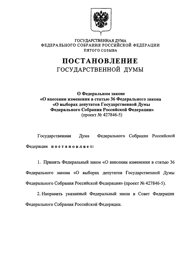 "О ФЕДЕРАЛЬНОМ ЗАКОНЕ "О ВНЕСЕНИИ ИЗМЕНЕНИЯ В СТАТЬЮ 36 ФЕДЕРАЛЬНОГО ЗАКОНА "О ВЫБОРАХ ДЕПУТАТОВ ГОСУДАРСТВЕННОЙ ДУМЫ ФЕДЕРАЛЬНОГО СОБРАНИЯ РОССИЙСКОЙ ФЕДЕРАЦИИ" (ПРОЕКТ N 427846-5)"