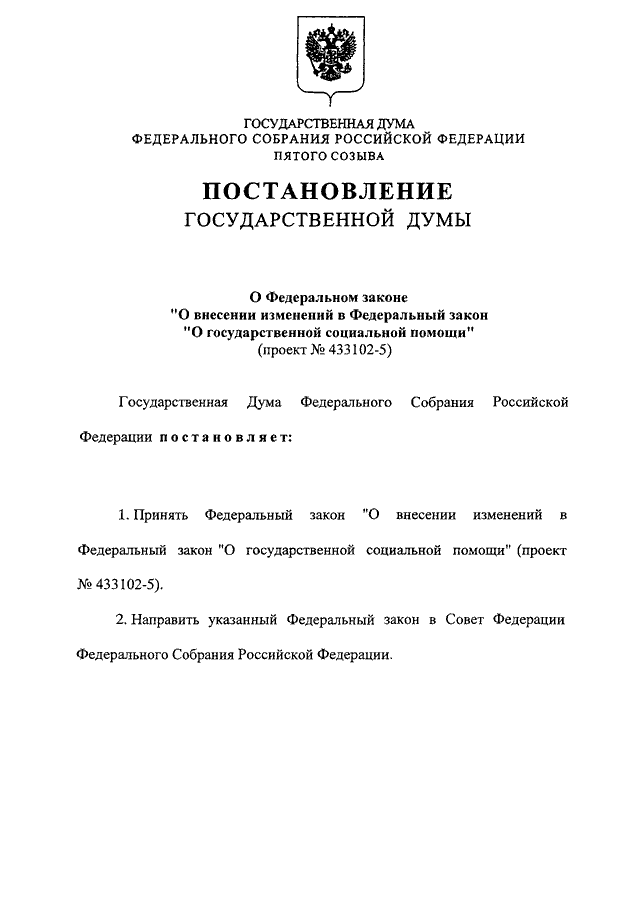"О ФЕДЕРАЛЬНОМ ЗАКОНЕ "О ВНЕСЕНИИ ИЗМЕНЕНИЙ В ФЕДЕРАЛЬНЫЙ ЗАКОН "О ГОСУДАРСТВЕННОЙ СОЦИАЛЬНОЙ ПОМОЩИ" (ПРОЕКТ N 433102-5)"