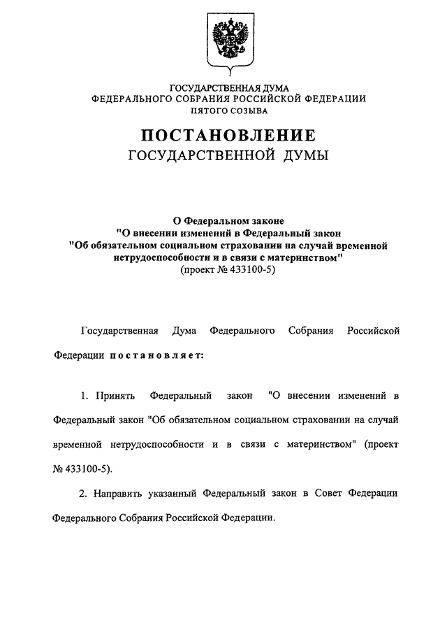 "О ФЕДЕРАЛЬНОМ ЗАКОНЕ "О ВНЕСЕНИИ ИЗМЕНЕНИЙ В ФЕДЕРАЛЬНЫЙ ЗАКОН "ОБ ОБЯЗАТЕЛЬНОМ СОЦИАЛЬНОМ СТРАХОВАНИИ НА СЛУЧАЙ ВРЕМЕННОЙ НЕТРУДОСПОСОБНОСТИ И В СВЯЗИ С МАТЕРИНСТВОМ" (ПРОЕКТ N 433100-5)"