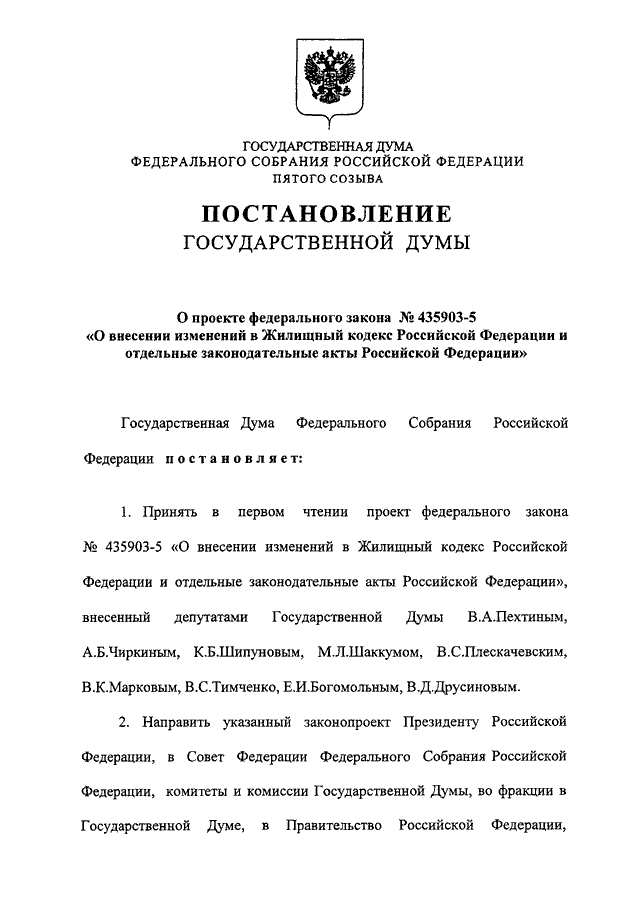 "О ПРОЕКТЕ ФЕДЕРАЛЬНОГО ЗАКОНА N 435903-5 "О ВНЕСЕНИИ ИЗМЕНЕНИЙ В ЖИЛИЩНЫЙ КОДЕКС РОССИЙСКОЙ ФЕДЕРАЦИИ И ОТДЕЛЬНЫЕ ЗАКОНОДАТЕЛЬНЫЕ АКТЫ РОССИЙСКОЙ ФЕДЕРАЦИИ"