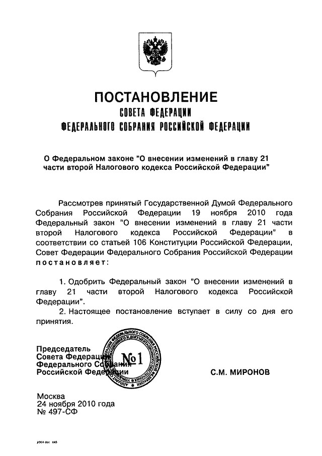 ПОСТАНОВЛЕНИЕ СФ ФС РФ от 24.11.2010 N 497-СФ