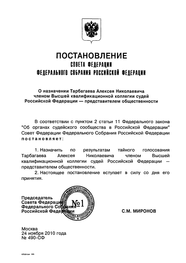 ПОСТАНОВЛЕНИЕ СФ ФС РФ от 24.11.2010 N 490-СФ