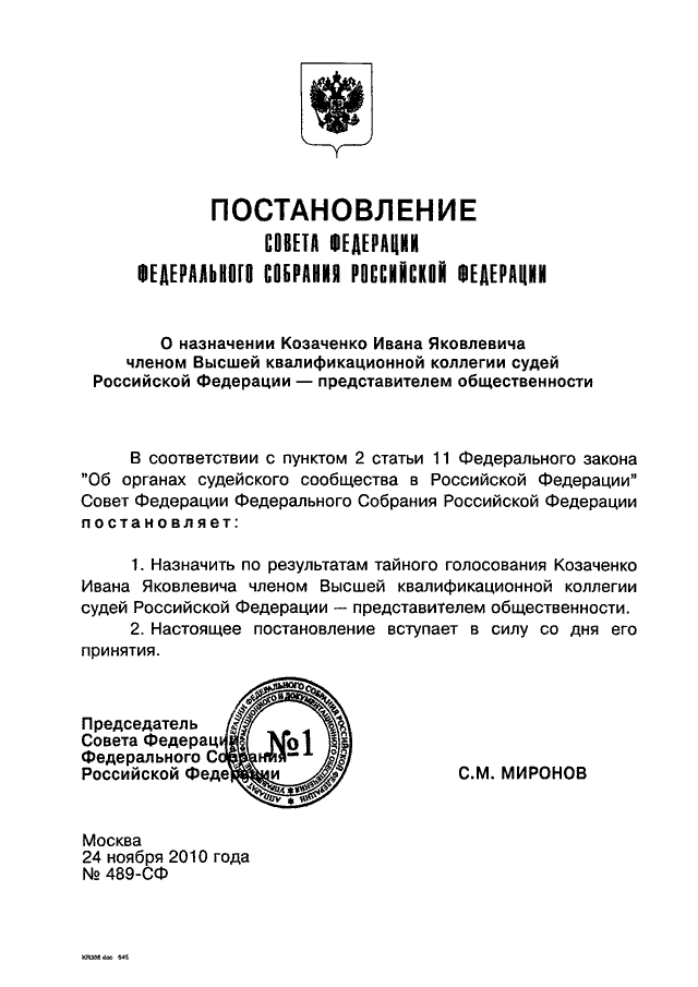 "О НАЗНАЧЕНИИ КОЗАЧЕНКО ИВАНА ЯКОВЛЕВИЧА ЧЛЕНОМ ВЫСШЕЙ КВАЛИФИКАЦИОННОЙ КОЛЛЕГИИ СУДЕЙ РОССИЙСКОЙ ФЕДЕРАЦИИ - ПРЕДСТАВИТЕЛЕМ ОБЩЕСТВЕННОСТИ"