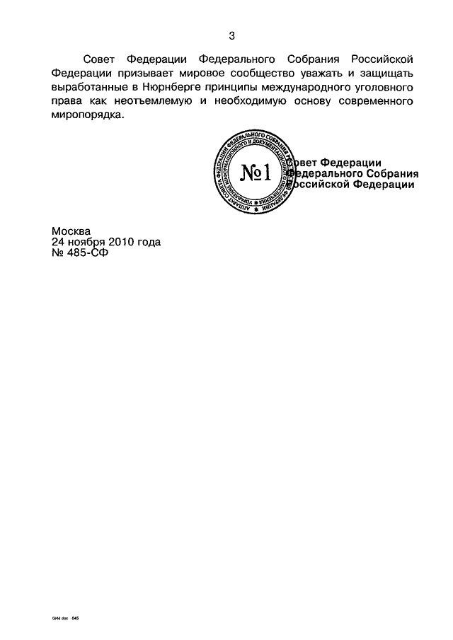 ЗАЯВЛЕНИЕ СФ ФС РФ от 24.11.2010 N 485-СФ