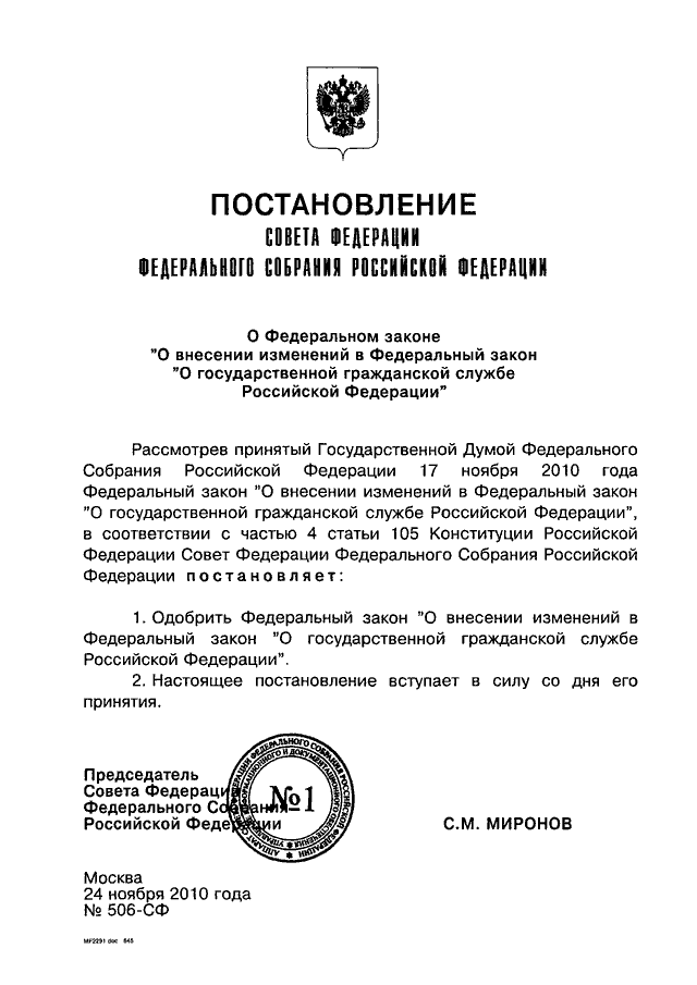 ПОСТАНОВЛЕНИЕ СФ ФС РФ от 24.11.2010 N 506-СФ