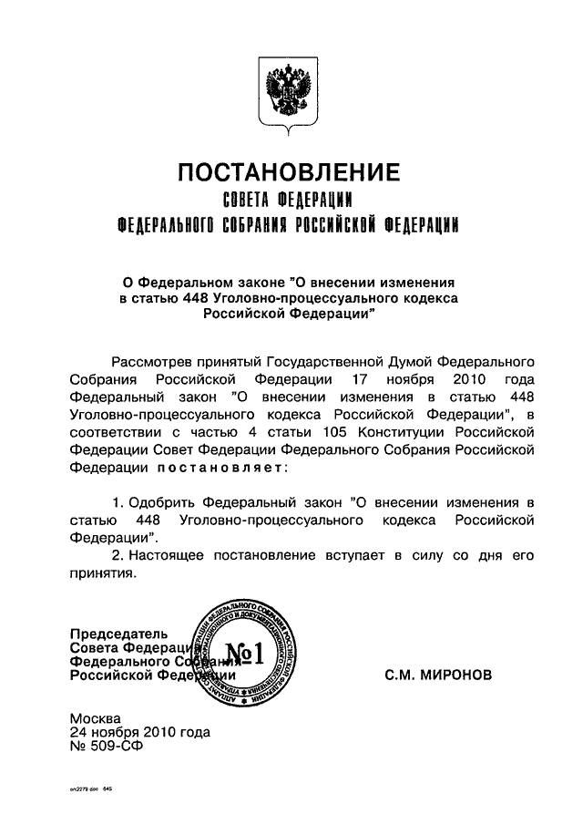 ПОСТАНОВЛЕНИЕ СФ ФС РФ от 24.11.2010 N 509-СФ