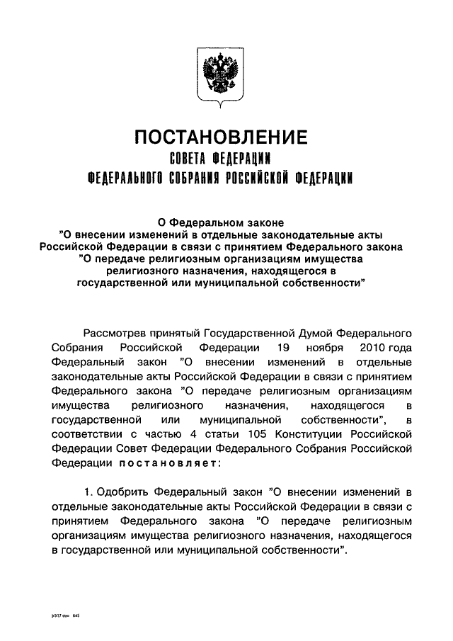 "О ФЕДЕРАЛЬНОМ ЗАКОНЕ "О ВНЕСЕНИИ ИЗМЕНЕНИЙ В ОТДЕЛЬНЫЕ ЗАКОНОДАТЕЛЬНЫЕ АКТЫ РОССИЙСКОЙ ФЕДЕРАЦИИ В СВЯЗИ С ПРИНЯТИЕМ ФЕДЕРАЛЬНОГО ЗАКОНА "О ПЕРЕДАЧЕ РЕЛИГИОЗНЫМ ОРГАНИЗАЦИЯМ ИМУЩЕСТВА РЕЛИГИОЗНОГО НАЗНАЧЕНИЯ, НАХОДЯЩЕГОСЯ В ГОСУДАРСТВЕННОЙ ИЛИ МУНИЦИПАЛЬНОЙ СОБСТВЕННОСТИ"