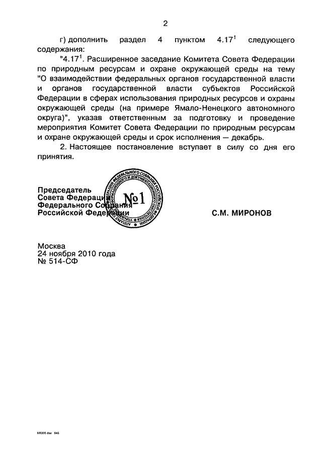 ПОСТАНОВЛЕНИЕ СФ ФС РФ от 24.11.2010 N 514-СФ