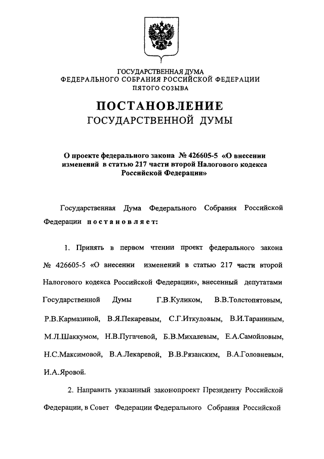 "О ПРОЕКТЕ ФЕДЕРАЛЬНОГО ЗАКОНА N 426605-5 "О ВНЕСЕНИИ ИЗМЕНЕНИЙ В СТАТЬЮ 217 ЧАСТИ ВТОРОЙ НАЛОГОВОГО КОДЕКСА РОССИЙСКОЙ ФЕДЕРАЦИИ"