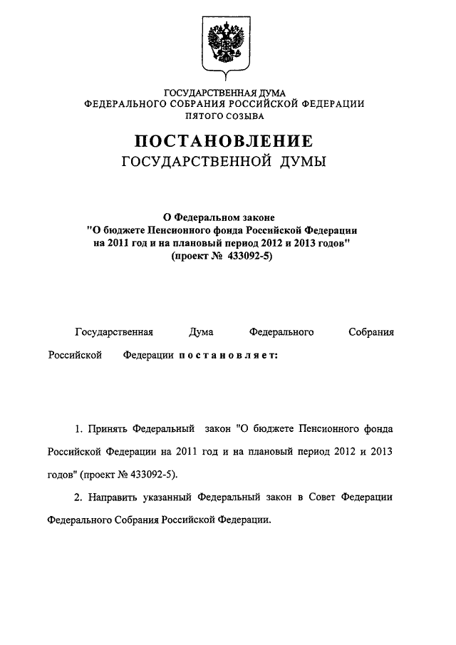 "О ФЕДЕРАЛЬНОМ ЗАКОНЕ "О БЮДЖЕТЕ ПЕНСИОННОГО ФОНДА РОССИЙСКОЙ ФЕДЕРАЦИИ НА 2011 ГОД И НА ПЛАНОВЫЙ ПЕРИОД 2012 И 2013 ГОДОВ" (ПРОЕКТ N 433092-5)"