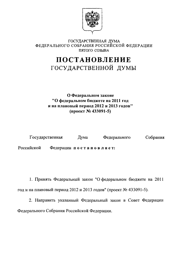 "О ФЕДЕРАЛЬНОМ ЗАКОНЕ "О ФЕДЕРАЛЬНОМ БЮДЖЕТЕ НА 2011 ГОД И НА ПЛАНОВЫЙ ПЕРИОД 2012 И 2013 ГОДОВ" (ПРОЕКТ N 433091-5)"