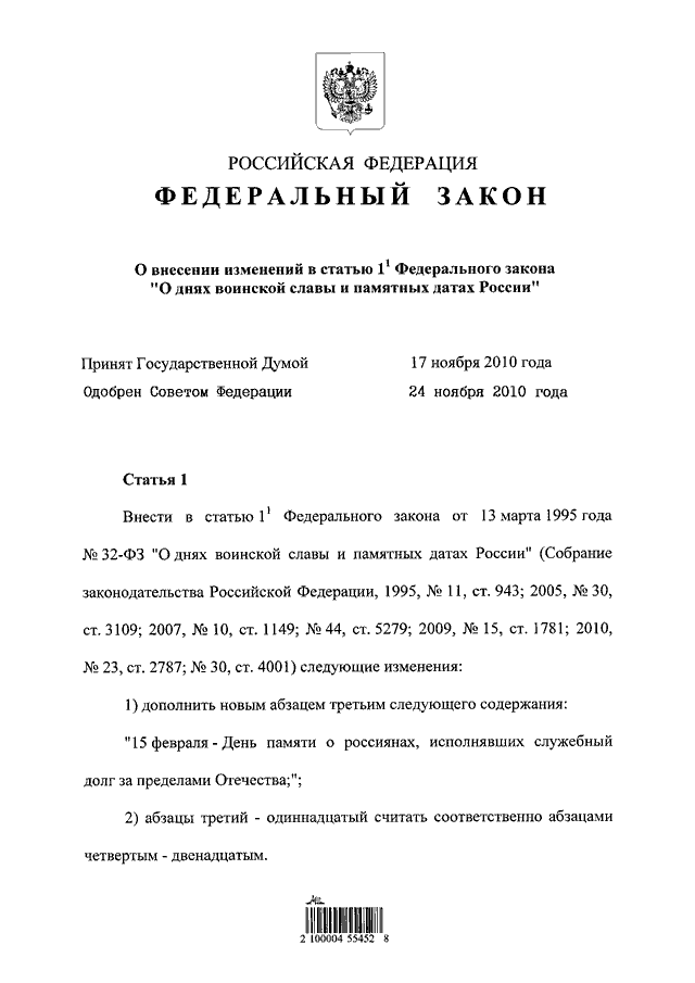 "О ВНЕСЕНИИ ИЗМЕНЕНИЙ В СТАТЬЮ 1.1 ФЕДЕРАЛЬНОГО ЗАКОНА "О ДНЯХ ВОИНСКОЙ СЛАВЫ И ПАМЯТНЫХ ДАТАХ РОССИИ"