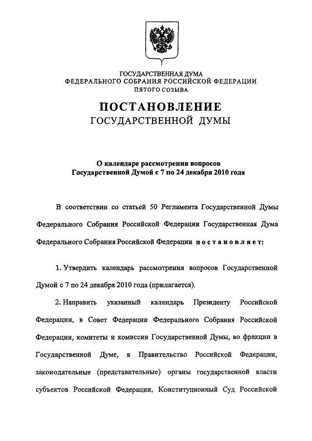"О КАЛЕНДАРЕ РАССМОТРЕНИЯ ВОПРОСОВ ГОСУДАРСТВЕННОЙ ДУМОЙ С 7 ПО 24 ДЕКАБРЯ 2010 ГОДА"