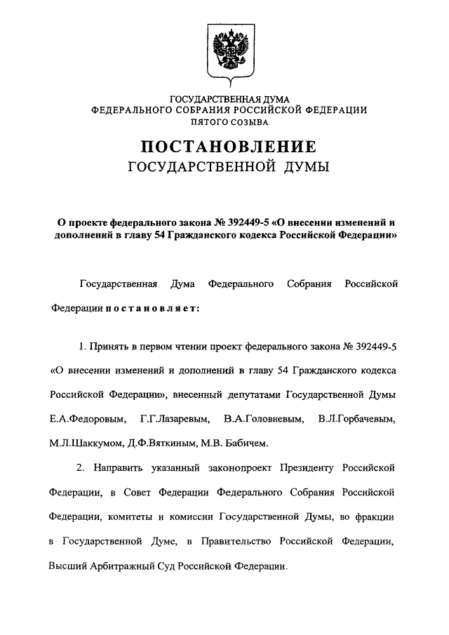 "О ПРОЕКТЕ ФЕДЕРАЛЬНОГО ЗАКОНА N 392449-5 "О ВНЕСЕНИИ ИЗМЕНЕНИЙ И ДОПОЛНЕНИЙ В ГЛАВУ 54 ГРАЖДАНСКОГО КОДЕКСА РОССИЙСКОЙ ФЕДЕРАЦИИ"