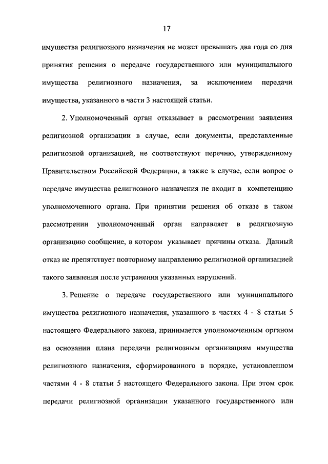 "О ПЕРЕДАЧЕ РЕЛИГИОЗНЫМ ОРГАНИЗАЦИЯМ ИМУЩЕСТВА РЕЛИГИОЗНОГО НАЗНАЧЕНИЯ, НАХОДЯЩЕГОСЯ В ГОСУДАРСТВЕННОЙ ИЛИ МУНИЦИПАЛЬНОЙ СОБСТВЕННОСТИ"