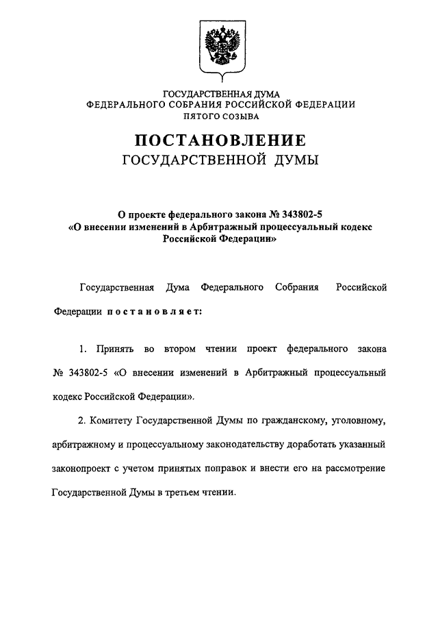 "О ПРОЕКТЕ ФЕДЕРАЛЬНОГО ЗАКОНА N 343802-5 "О ВНЕСЕНИИ ИЗМЕНЕНИЙ В АРБИТРАЖНЫЙ ПРОЦЕССУАЛЬНЫЙ КОДЕКС РОССИЙСКОЙ ФЕДЕРАЦИИ"