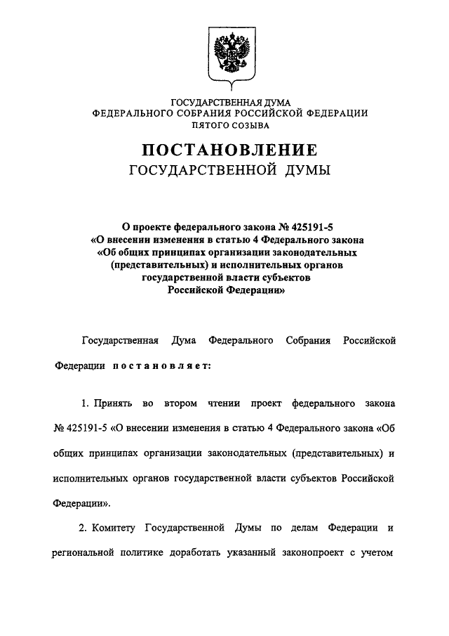 "О ПРОЕКТЕ ФЕДЕРАЛЬНОГО ЗАКОНА N 425191-5 "О ВНЕСЕНИИ ИЗМЕНЕНИЯ В