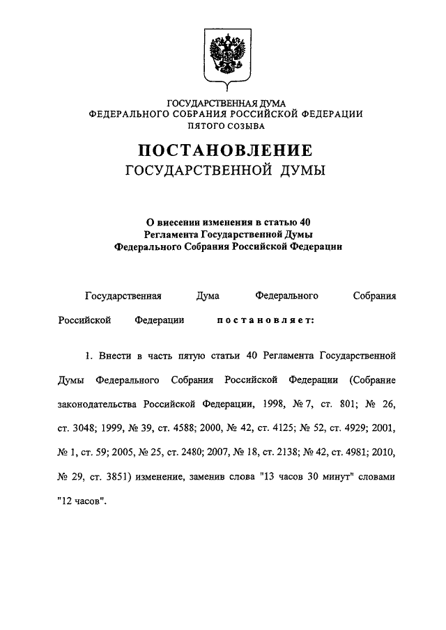 "О ВНЕСЕНИИ ИЗМЕНЕНИЯ В СТАТЬЮ 40 РЕГЛАМЕНТА ГОСУДАРСТВЕННОЙ ДУМЫ ФЕДЕРАЛЬНОГО СОБРАНИЯ РОССИЙСКОЙ ФЕДЕРАЦИИ"