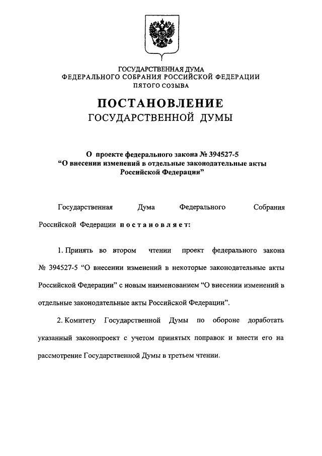 "О ПРОЕКТЕ ФЕДЕРАЛЬНОГО ЗАКОНА N 394527-5 "О ВНЕСЕНИИ ИЗМЕНЕНИЙ В ОТДЕЛЬНЫЕ ЗАКОНОДАТЕЛЬНЫЕ АКТЫ РОССИЙСКОЙ ФЕДЕРАЦИИ"